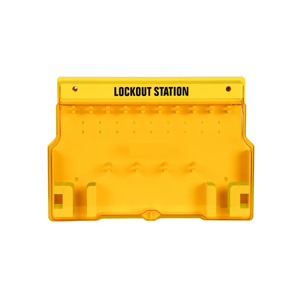 Covered Station for 10 Safety Padlocks. Can accmmodate 10 Thermoplastic Safety Padlocks with Different Keys,4 Lockout Hasps and 10 Dangerous Do Not Operate Safety Tags. Trilingual – Station message printed in English. Spanish and French labels included for optional application. Covered Station for 10 Safety Padlocks